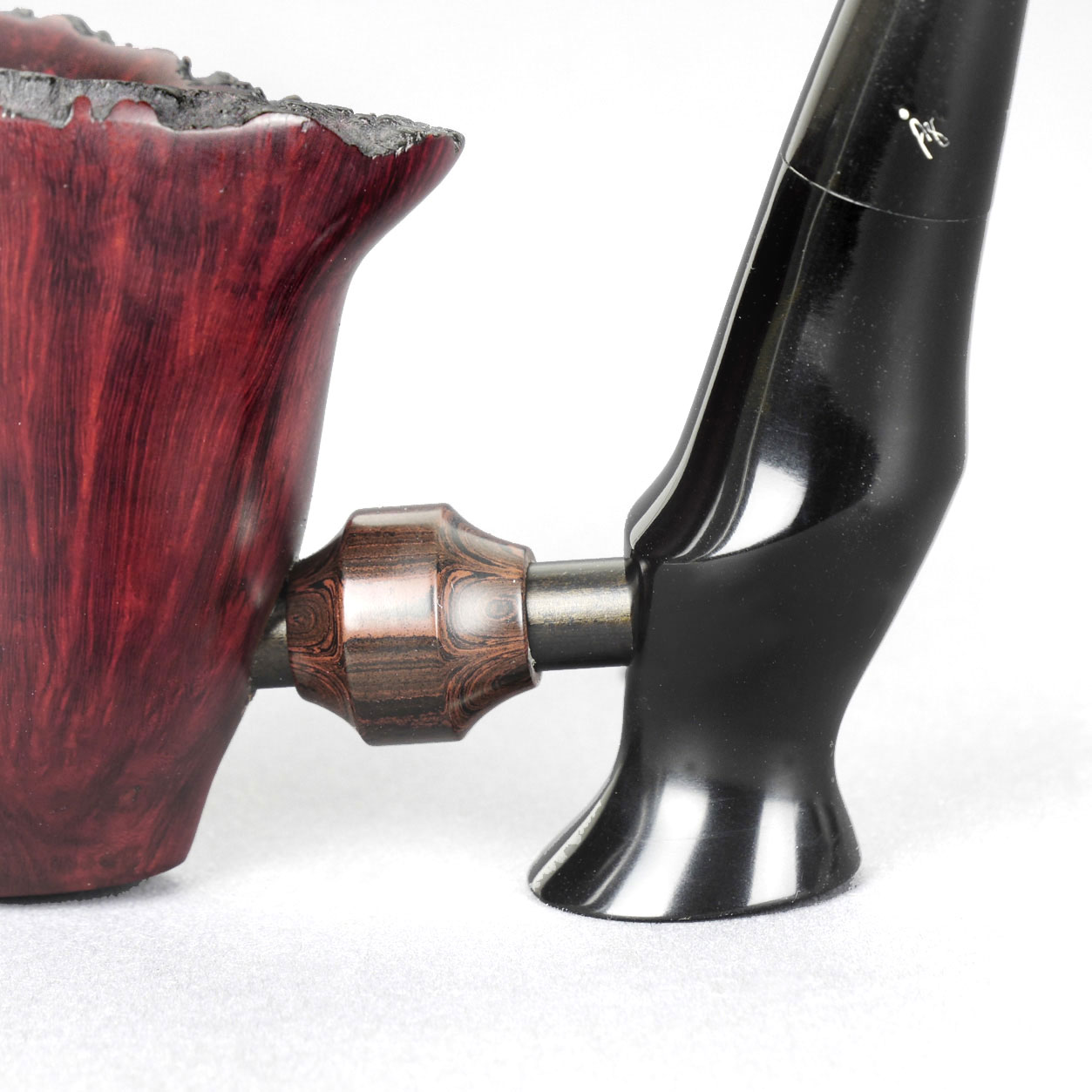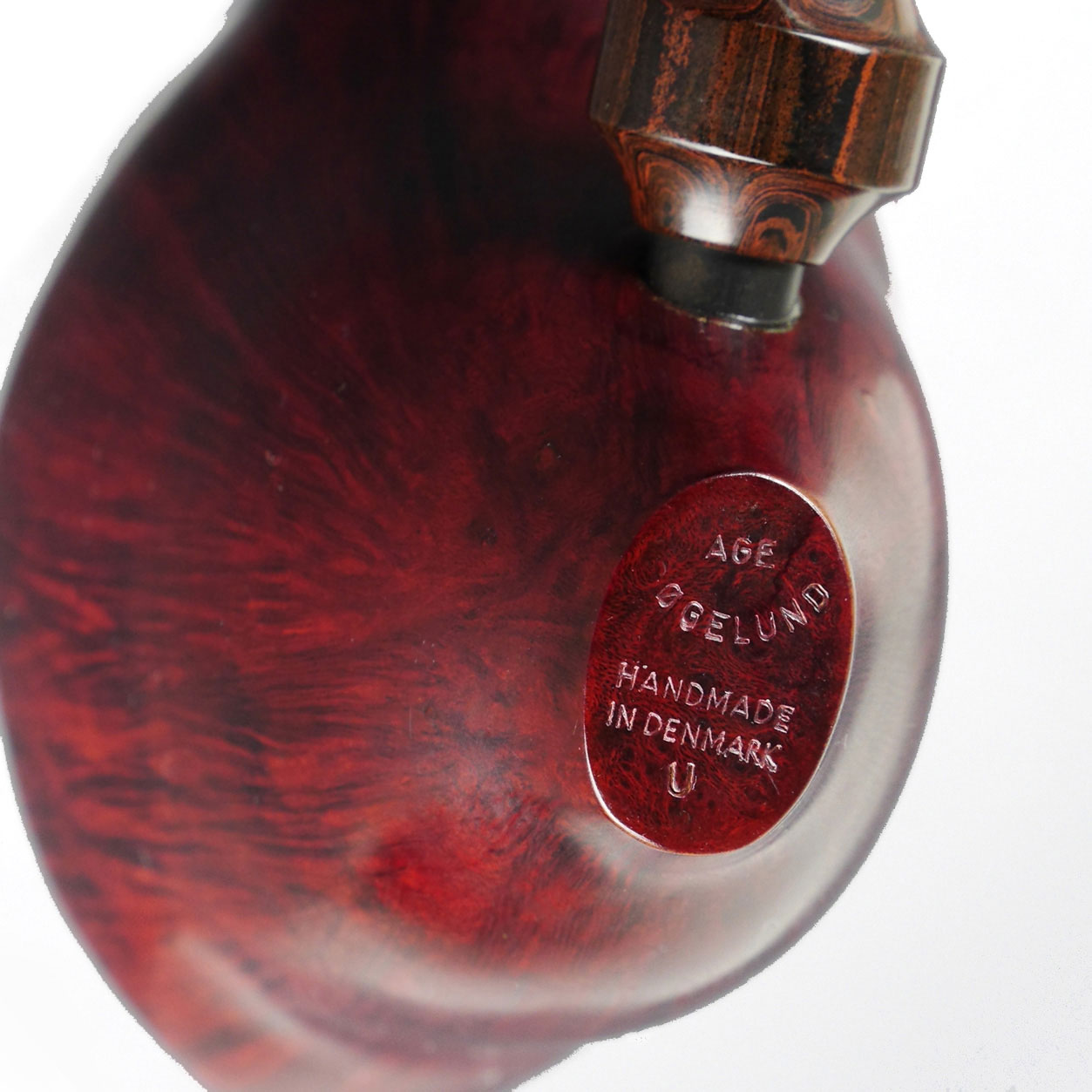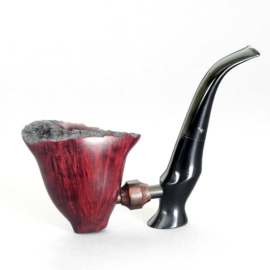 Åge Bøgelund is known for its extraordinary freehand pipes. This pipe is a typical "Bøgelund": extreme freehand design, but still very functional. This pipe stands! The separable ebonite mouthpiece is connected to the pipe via a flamed acrylic bridge. This makes the pipe very easy to clean. Another advantage of this construction: this pipe smokes very dry, as no moisture gets into the bowl. A unique collector's item made in Denmark.