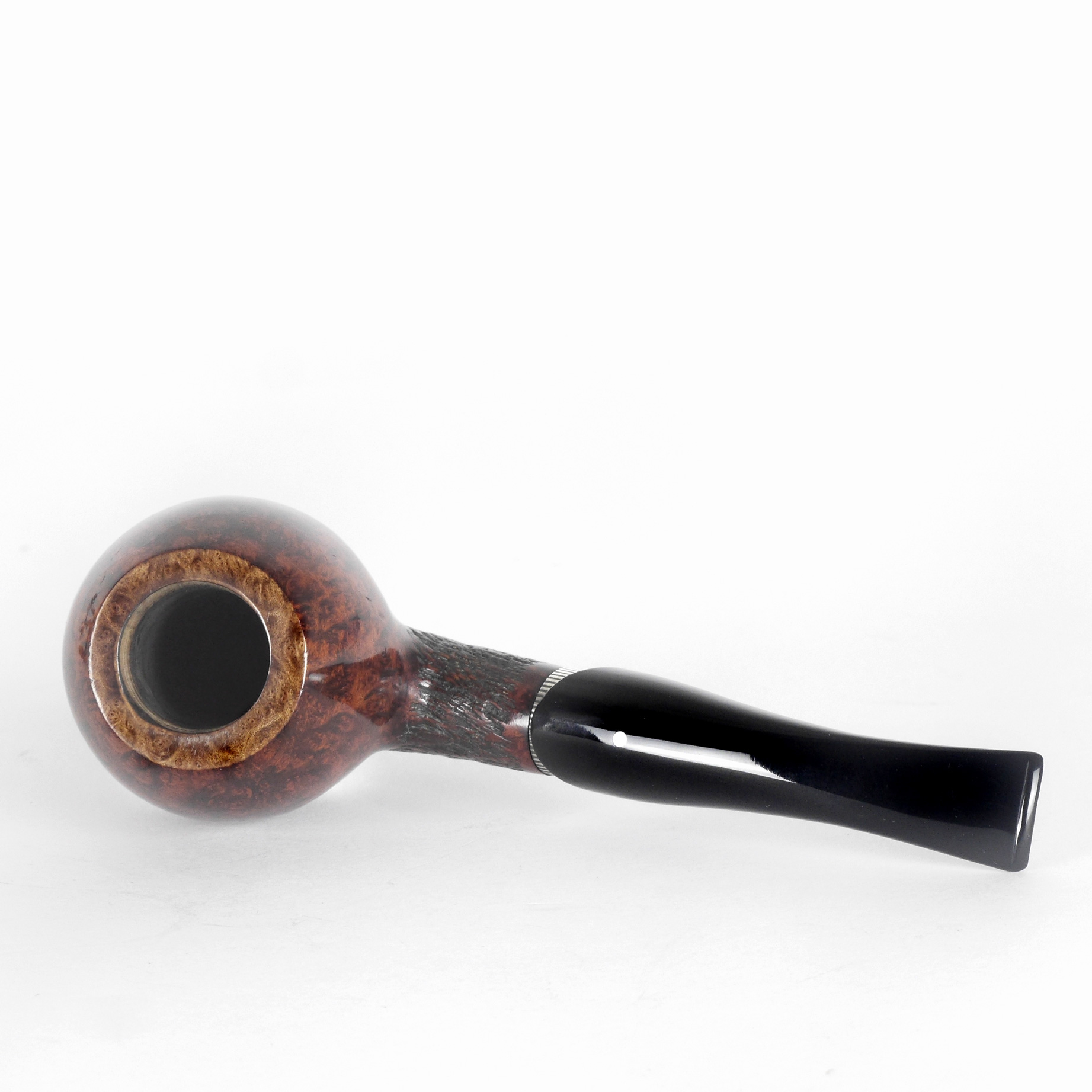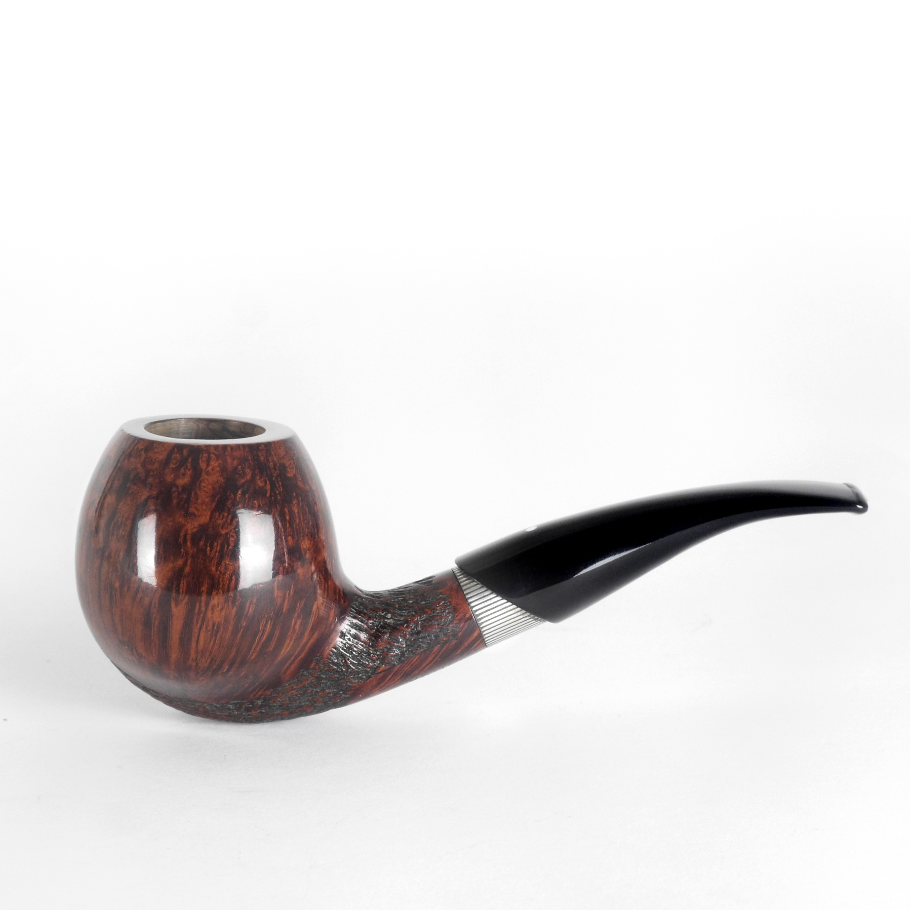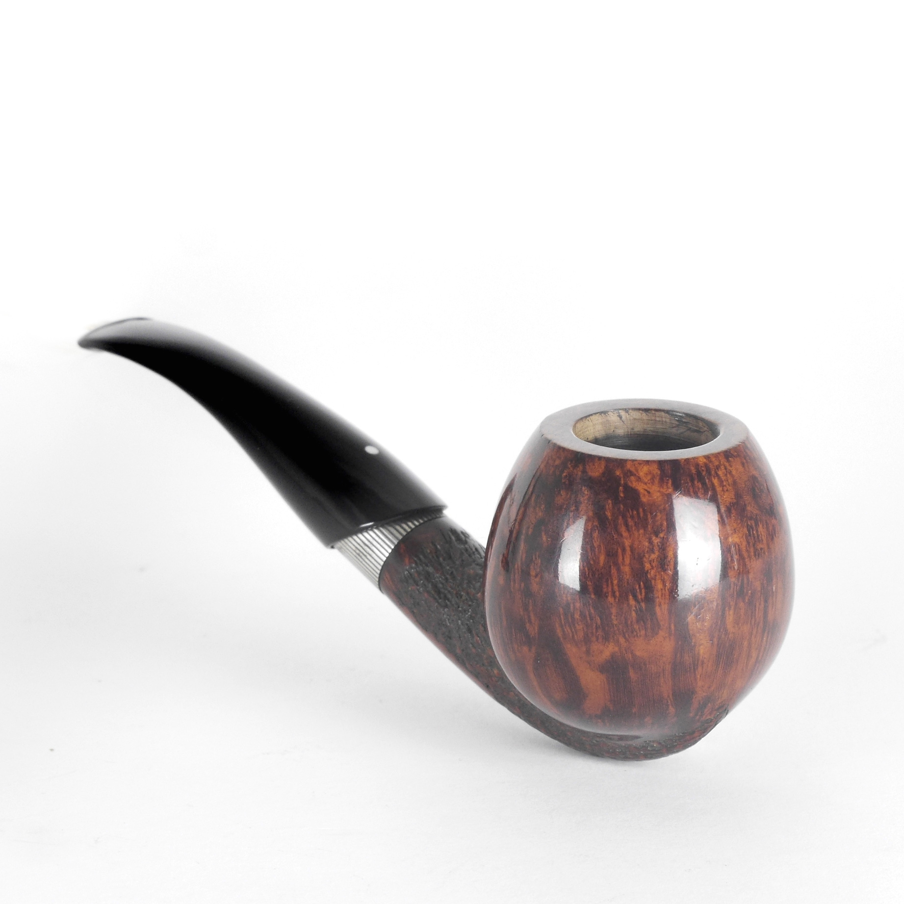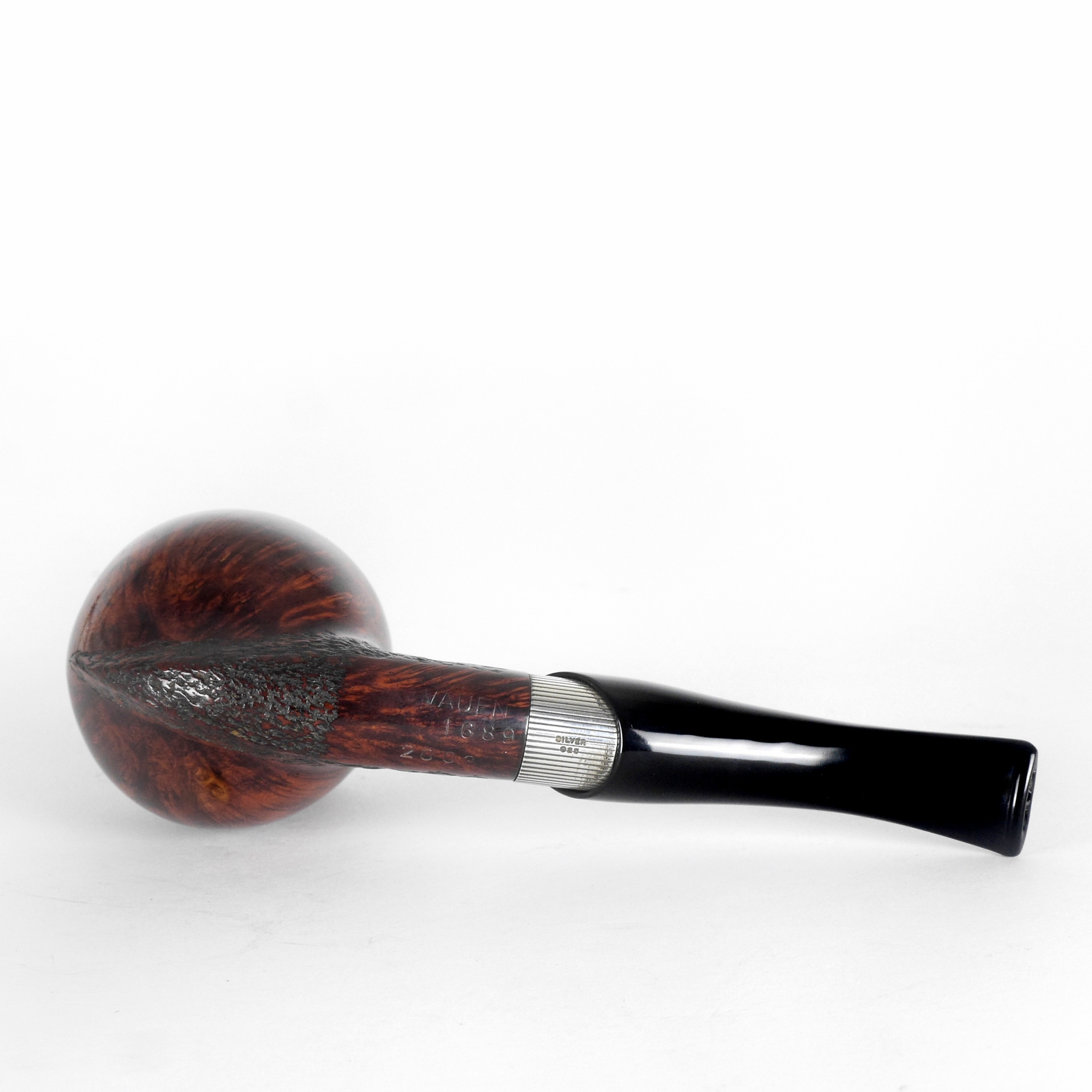 A fine rustication runs from the base of the pipe to the stem and ends in a wide, grooved silver ring. This is half covered by an elaborately crafted mouthpiece.